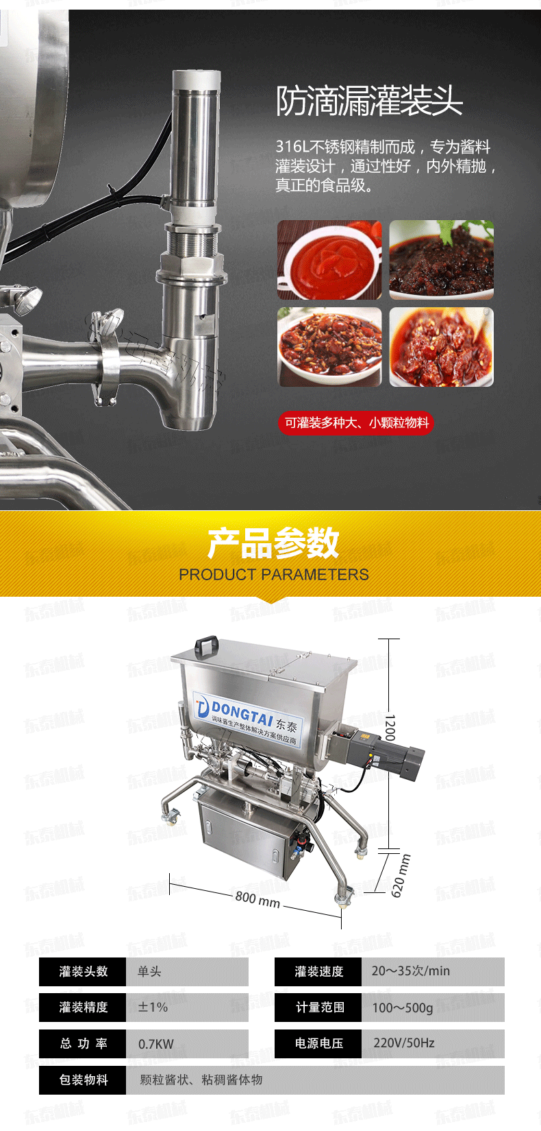 4、顆粒醬定量灌裝機主要針對食品行業(yè)的醬類分裝設計生產(chǎn),香菇醬灌裝機特別適用于調(diào)味品中帶顆粒并且濃度較大的辣椒醬、豆瓣醬、花生醬、芝麻醬、果醬、牛油火鍋底料、紅油火鍋底料等物質(zhì)的粘稠醬類的灌裝;