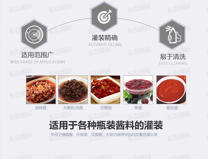 這款辣椒醬灌裝機是我公司結合自身十幾年的生產經驗,加之灌裝機技術,進行設計的產品,其結構更加簡單、操作更加簡便。小型辣椒醬灌裝機可灌裝顆粒漿狀流體物料,特別適用于調味品中帶顆粒并且濃度較大的辣椒醬、火鍋底料等粘稠醬類的灌裝,配置的自動攪拌器,保證了醬和油的充分混合,又稱為辣椒醬灌裝機、花生醬灌裝機、豆瓣醬灌裝機、果醬灌裝機,芝麻醬灌裝機、粘稠醬類灌裝機、牛肉醬灌裝機